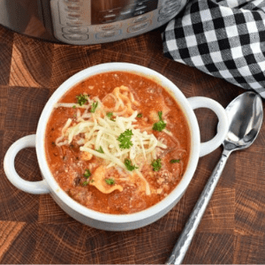 To cook: Brown ground beef in the instant pot. Drain. Add remaining ingredients and finish cooking. Total prep and cooking time is 30 minutes. Click here for the full recipe from Skinny Comfort.