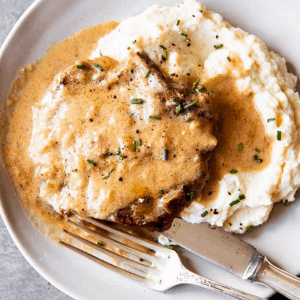 To cook: Saute onions and butter. Add pork chops. Cook a little bit more. Add remaining ingredients and finish cooking pork chops. Remove pork chops and create gravy. Then it’s ready to eat! Click here for the full recipe from Wholesome Recipe Box.
