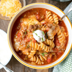 To cook: Saute beef and spices in an instant pot. Drain. Add remaining ingredients (except cheese) and finish cooking. Add cheese and melt for 5 minutes. You can add a dollop of sour cream to the top of each serving. It only takes you 13 minutes from start to ready to eat. Click here for the full recipe from The Typical Mom.