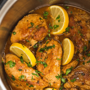 To cook: Season chicken and saute in instant pot. Remove chicken and saute onions. Add cooked chicken and additional ingredients and finish cooking. After it’s finished cooking, top with lemon juice and it’s ready to eat. Serve with mashed potatoes or rice. Click here for the full recipe from Nourish Plate.